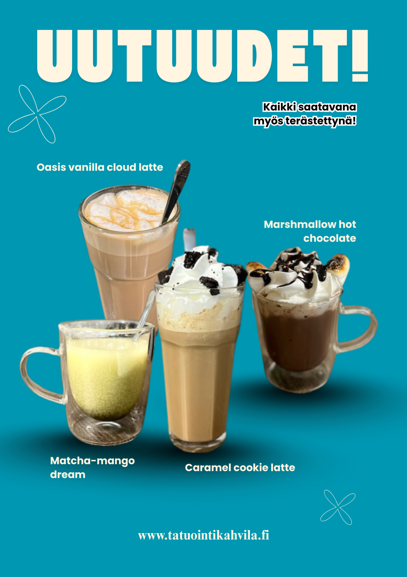 Oasis tatuointikahvila on erikoiskahvila. Meiltä löytyy normaalin kahvilan lisäksi myös A- oikeudet. Kahvilan omina tuotteina löytyy laaja valikoima pirtelöitä, joissa on samettisen koostumuksen lisäksi maittavat maut. Drinkit ovat myös tarkoin valittuja makuja hivelevin ominaisuuksin. Meillä voi järjestää tapahtumia sekä yksityistilaisuuksia. Tilat ovat muunneltavissa sopimuksesta. Tatuoinnit voit varata ajanvarauksella varausmaksua vastaan, joka huomioidaan loppusummassa. Tai halutessasi voit tulla suoraan paikan päälle ja odottaa vuoroasi. Suuremmat työt suunnitellaan yhdessä ja tekoon varataan oma aikansa. Tatuoinnit tehdään siihen tarkoitetussa tilassa, ei siis kahvilan tiloissa. Lisäksi tatuoijamme on kouluttautunut hammaskoru teknikoksi, joten valikoimaamme on lisätty hammaskorut.