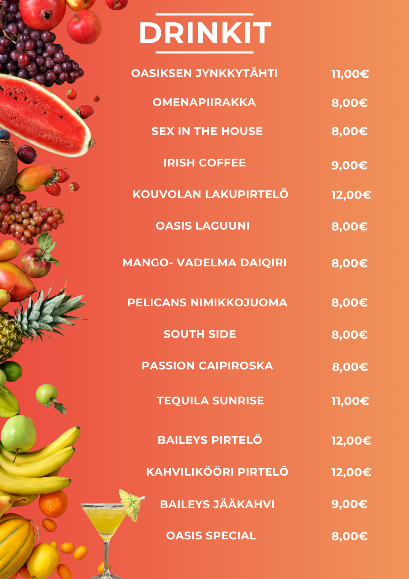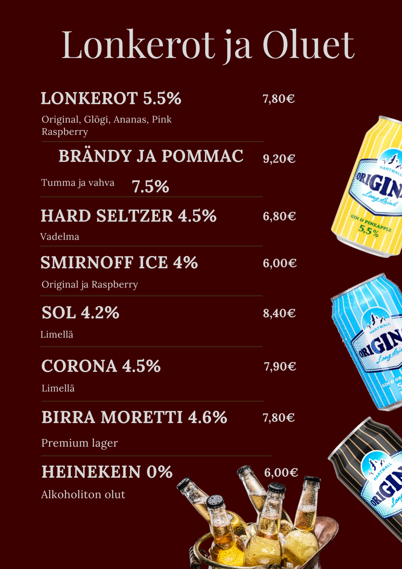 Tarjoamme laajan valikoiman herkullisia juomia, jotka täydentävät täydellisesti rentoutumisesi hetkiä. Meiltä löydät niin virkistäviä alkoholittomia vaihtoehtoja kuin eri olut- ja viinibrändejä, jotka ovat täydellinen valinta peli-iltaan ystävien kanssa.